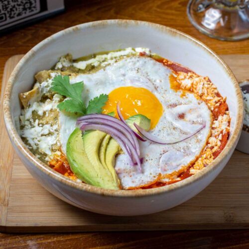 Salsa roja y verde, totopo horneado, crema artesanal, queso fresco, frijoles y aguacate extra. NATURALES $79.ºº, CON HUEVO $85.ºº O CON POLLO $103.